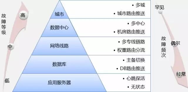 高可用金字塔是分层解耦的,也就是说,每一层故障概率是独立的。自下而上,故障等级越来越高,但是故障概率越来越低。这种设计确保了整个网联平台的“不可用”取决于金字塔的最顶层故障概率。很显然,城市级(乃至全国性)灾难的概率和中彩票的概率差不多。
