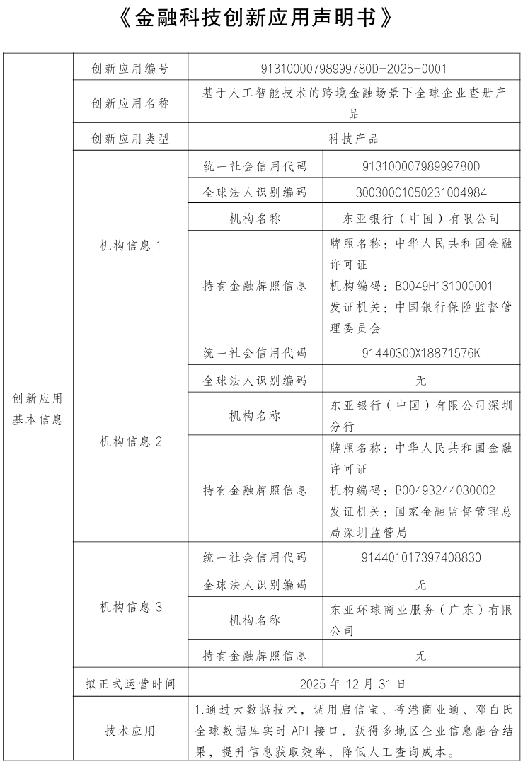 金融科技创新应用声明书:基于人工智能技术的跨境金融场景下全球企业查册产品
