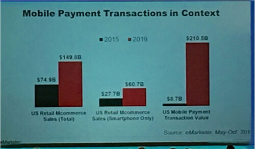 推出一年的苹果 Apple Pay 是会议上最受大家关注的移动支付方式,数据表示有 14%用户已经绑定银行卡,数字还在不断增长,比较有意思的是,已经接受 Apple Pay 的商户也是业绩比较好的商户,说明接受苹果支付也是品牌营销战略一部分。