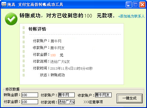 高仿版支付宝也叫 “支付宝高仿转账成功工具”,利用这种软件,可以轻松的制造出支付宝付款截图和转账截图,仿真度很高,一般人很难识别。