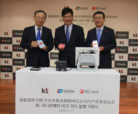 6月27日,银联国际与韩国KT集团及其子公司BC卡公司共同宣布,在韩国首次发行银联HCE云闪付产品,当地银联卡持卡人将可通过手机用“云闪付”一拍即付,韩国成为云闪付落地境外市场的第一站。中国银联董事长葛华勇、KT集团会长黄昌奎、BC卡公司社长徐俊熙等出席发布仪式。