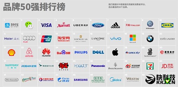 此外,这份榜单中包含的中国本土品牌还有排名第8的天猫,第11位的海尔,13位的银联,14位的淘宝,24位的百度,28位的格力,30位的招商银行等。