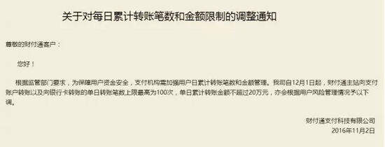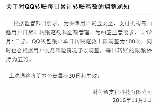 上图为自12月1日起,财付通和QQ支付账户对于“转账”笔数和每日具体限额的通知