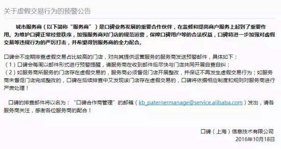 口碑会不定期排查虚假交易占比较高的门店,对向其提供运营服务的服务商发送预警邮件,具体如下: