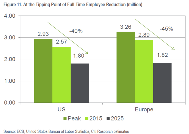 花旗预计,2015--2025年间,银行雇员将减少30%,且下跌速度会由近些年的每年2%上升到3%。
