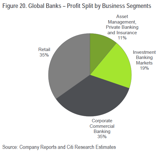 花旗估计,全球范围内,零售银行业务利润占总利润的35%,而这个比例在美国、欧洲则还要高,占比达40%。