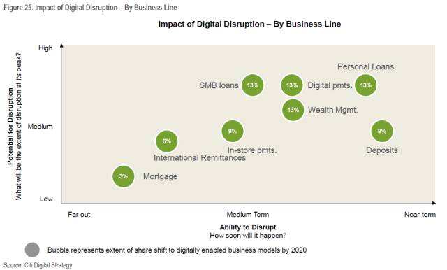 花旗将最容易受FinTech公司影响的业务做了一张矩阵表。越往上,表示这些业务越容易受到FinTech威胁;越往右,则表示这些威胁越逼近。