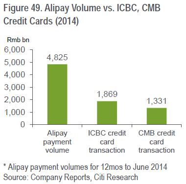 图中可以看到,支付宝的支付量已超过了工商银行和招商银行信用卡交易量的总和。
