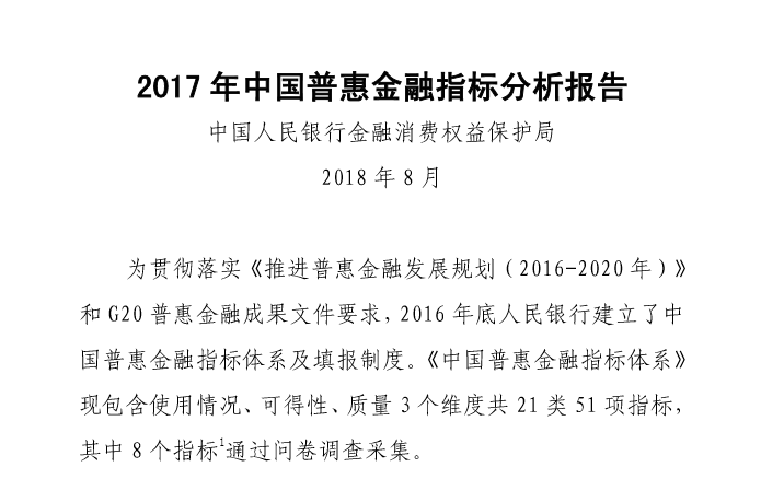 央行发布《2017年中国普惠金融指标分析报告》