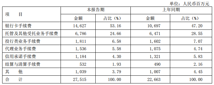 其中,综合往期财报来看,银行卡手续费收入保持持续增长,2019年半年报显示,收入达146亿元,较去年同期增长27%。
