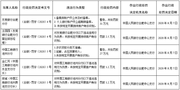 其中,中国工商银行池州分行因涉农贷款分类不准确;延解、占压预算收入;未按规定开展客户身份识别3项违规行为被央行合肥中心支行警告并罚款27万元。同时,时任中国工商银行池州东至支行行长金仁芳和中国工商银行池州贵池支行行长陈诚因对该行未按规定开展客户身份识别负责被分别罚款1.2万元。