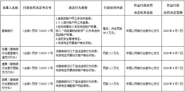 徽商银行因备案类账户开立未及时备案;个人银行账户开立未备案;经收预算收入未在规定账户核算,转入“待结算财政款项”以外其他科目或账户核算;违反安全管理规定;未按规定开展客户身份识别5项违法行为被央行合肥中心支行警告并罚款警告并罚款49.5万元。同时,时任徽商银行合肥香樟大道支行行长徐慧、徽商银行合肥宁国路支行行长唐勇因对该行未按规定开展初次客户身份识别负责被分别罚款1.2万元,而徽商银行合肥新站支行行长胡昊因对该行未按规定调整客户风险等级负责被罚款1.5万元。