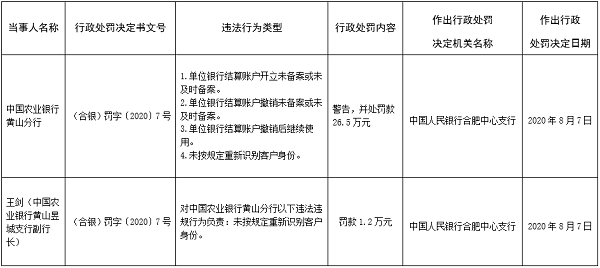 中国农业银行黄山分行因单位银行结算账户开立未备案或未及时备案;单位银行结算账户撤销未备案或未及时备案;单位银行结算账户撤销后继续使用;未按规定重新识别客户身份4项违规行为被央行合肥中心支行警告并罚款26.5万元。同时,时任中国农业银行黄山昱城支行副行长王剑因对该行未按规定重新识别客户身份负责被罚款1.2万元。