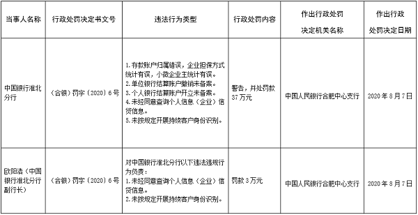 中国银行淮北分行因存款账户归属错误,企业担保方式统计有误,小微企业主统计有误;单位银行结算账户撤销未备案;个人银行结算账户开立未备案;未经同意查询个人信息(企业)信贷信息;未按规定开展持续客户身份识别5项违规行为被央行合肥中心支行警告并罚款37万元。同时,时任中国银行淮北分行副行长欧阳浩因对该行未经同意查询个人信息(企业)信贷信息和未按规定开展持续客户身份识别负责被罚款3万元。