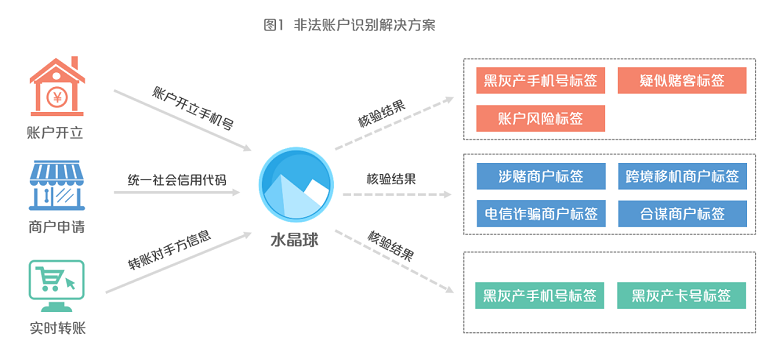 非法账户识别解决方案。针对非法账户识别环节,银联“水晶球”产品可提供如下三类场景的验证方案:账户开立场景、商户申请场景、实时转账场景,机构用户可分别通过输入账户开立手机号、统一社会信用代码、转账对手方信息,以获取核验结果,其中包括涉赌人群标签、涉赌商户标签、跨境移机商户标签、电信诈骗商户标签等。机构可根据上述核验标签结果,对非法账户进行识别确认及处置(图1)。
