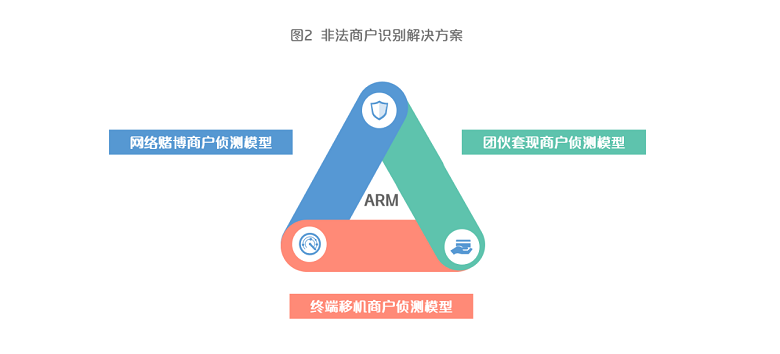 非法商户识别解决方案。针对非法商户隐藏深、识别难的行业痛点,银联ARM产品可以为收单机构提供可疑商户的预警服务,主要包括网络赌博商户识别、终端移机商户识别、团伙套现商户识别三大类场景。机构可根据可疑商户的预警结果,结合不同的风控策略对相关商户进行调查核实及风险处置,经多家合作机构调查反馈,该方案识别准确率已达80%以上(图2)。