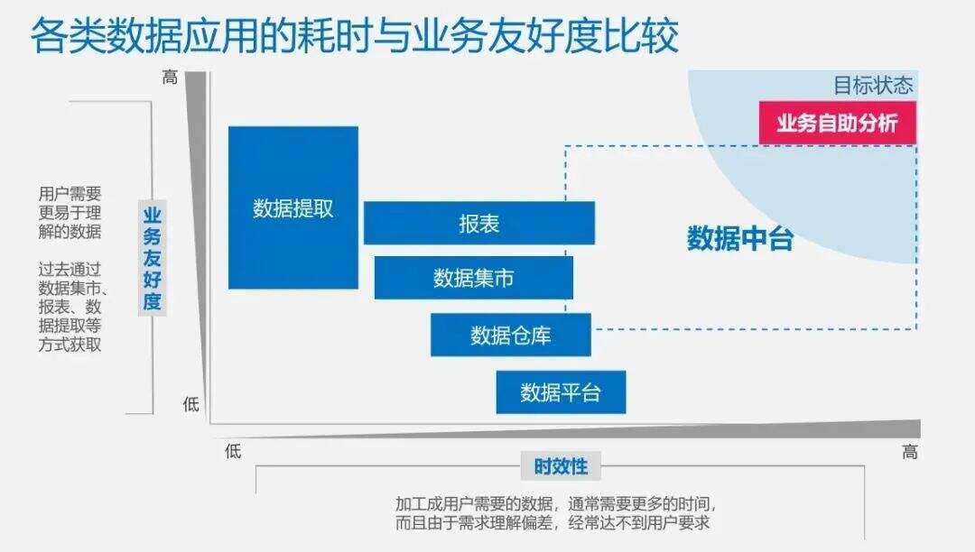 在我们传统的数据应用中,随着数据对于业务友好度的增加,其时效性也在减弱。而我们的目标,显然是数据又快又好。既然各部门的需求都不一样,为何不让业务自助分析数据呢?于是我们有了右上角的目标状态。但是这个理想状态和我们现在的数据应用中间有巨大的空隙,靠什么来填补?答案是数据中台。