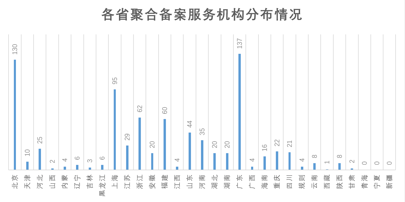 聚合支付技术服务备案排名前三的省份为广东(137家)、北京(130家)、上海(95家)。其中青海、宁夏、新疆3省份均无聚合支付技术服务备案服务机构。