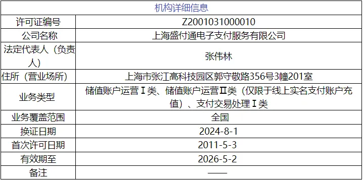 公开资料显示,盛付通成立于2008年6月13日,注册资本为2.5亿元,2011年5月获得首批支付牌照。获牌初期,盛付通资质类型仅为互联网支付及预付卡发行与受理(仅限于线上直接消费及实名支付账户充值)。后来通过增项,盛付通又获许可,拓展了移动电话支付、固定电话支付、银行卡收单等业务类型。支付业务类型重新划分后,盛付通的业务类型也调整为“储值账户运营Ⅰ类、储值账户运营Ⅱ类(仅限于线上实名支付账户充值)、支付交易处理Ⅰ类”。