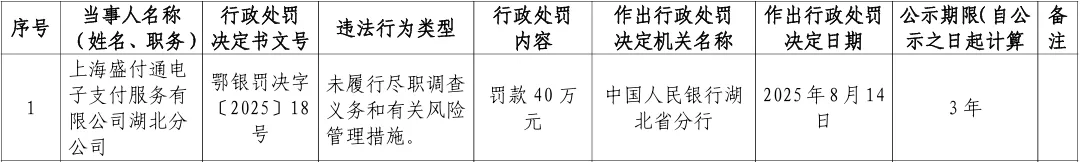 除了旗下应用多次被通报外,盛付通近期还遭到人民银行行政处罚。根据人民银行湖北省分行8月21日公布的行政处罚信息,盛付通湖北分公司因未履行尽职调查义务和有关风险管理措施被罚款40万元。