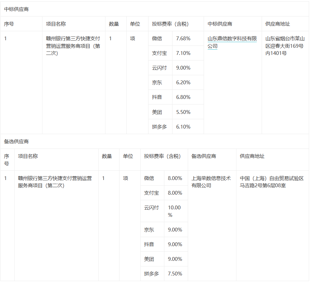赣州银行第三方快捷支付营销运营服务商项目中标结果公告