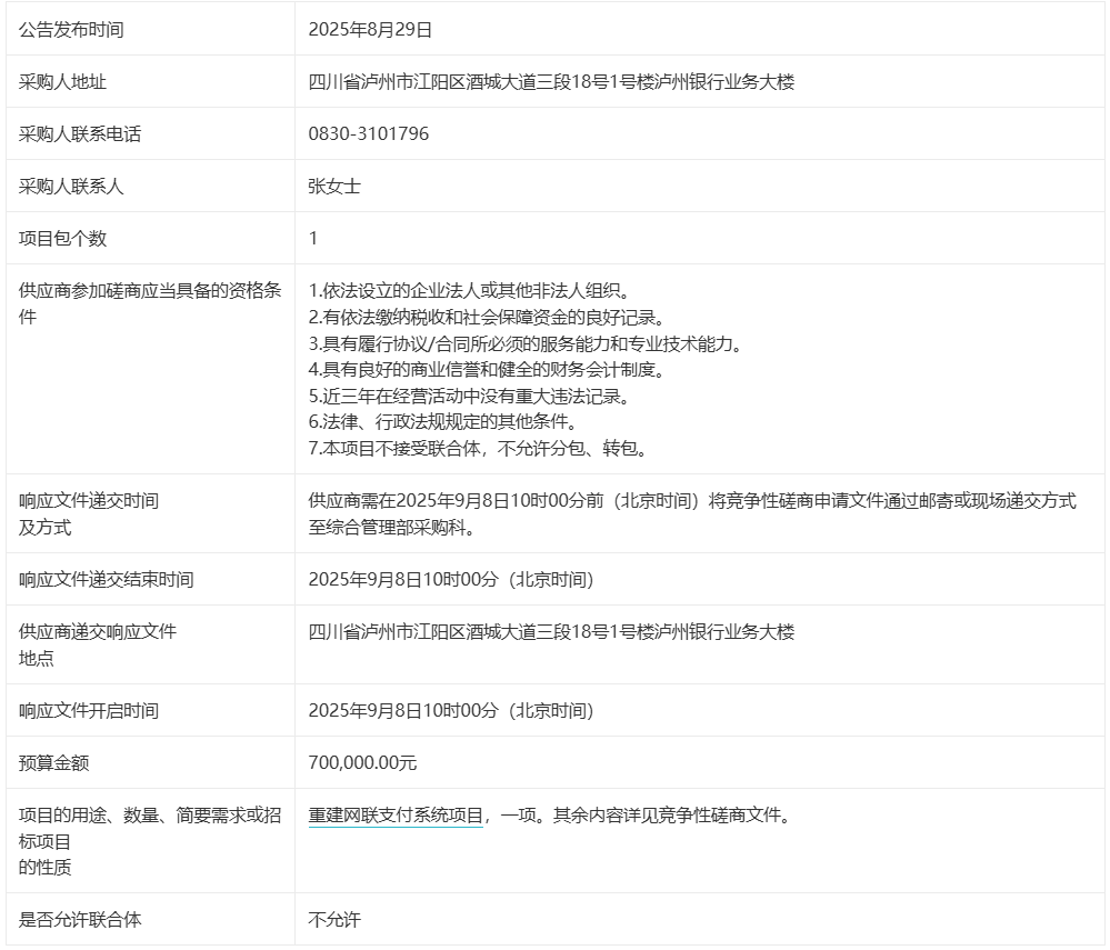 - 泸州银行关于重建网联支付系统项目成交候选人公示