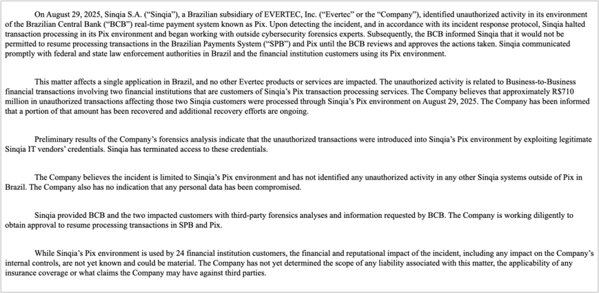 SEC文件写道:“2025年8月29日,Evertec旗下的巴西子公司Sinqia S.A.在巴西央行实时支付系统Pix的环境中发现了未经授权的活动。”