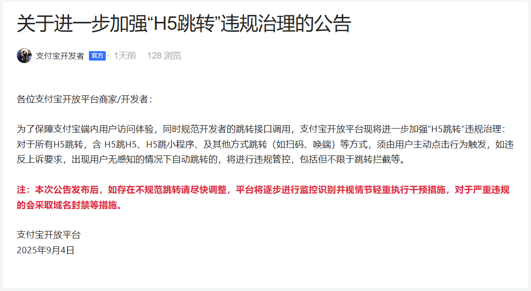 9月4日,支付宝开放平台发布关于进一步加强“H5跳转”违规治理的公告。公告称,为了保障支付宝端内用户访问体验,同时规范开发者的跳转接口调用,支付宝开放平台现将进一步加强“H5跳转”违规治理:对于所有H5跳转,含 H5跳H5、H5跳小程序、及其他方式跳转(如扫码、唤端)等方式,须由用户主动点击行为触发,如违反上诉要求,出现用户无感知的情况下自动跳转的,将进行违规管控,包括但不限于跳转拦截等。