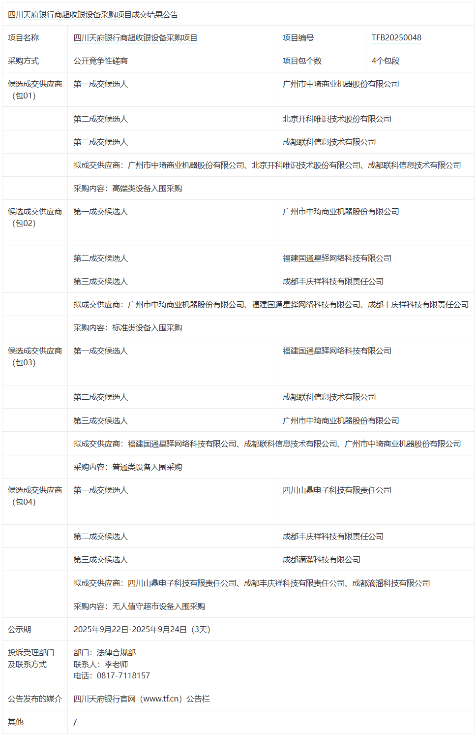四川天府银行商超收银硬件设备采购项目公开竞争性磋商公告