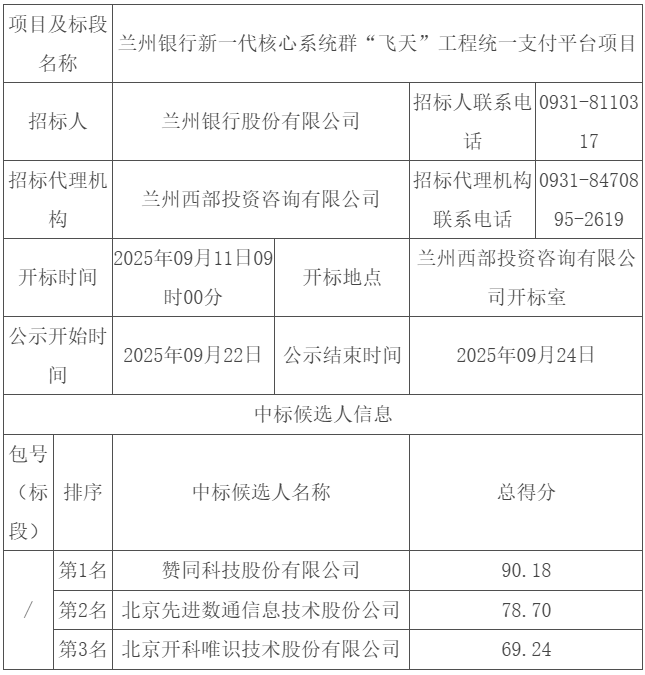 兰州银行新一代核心系统群“飞天”工程统一支付平台项目中标公示