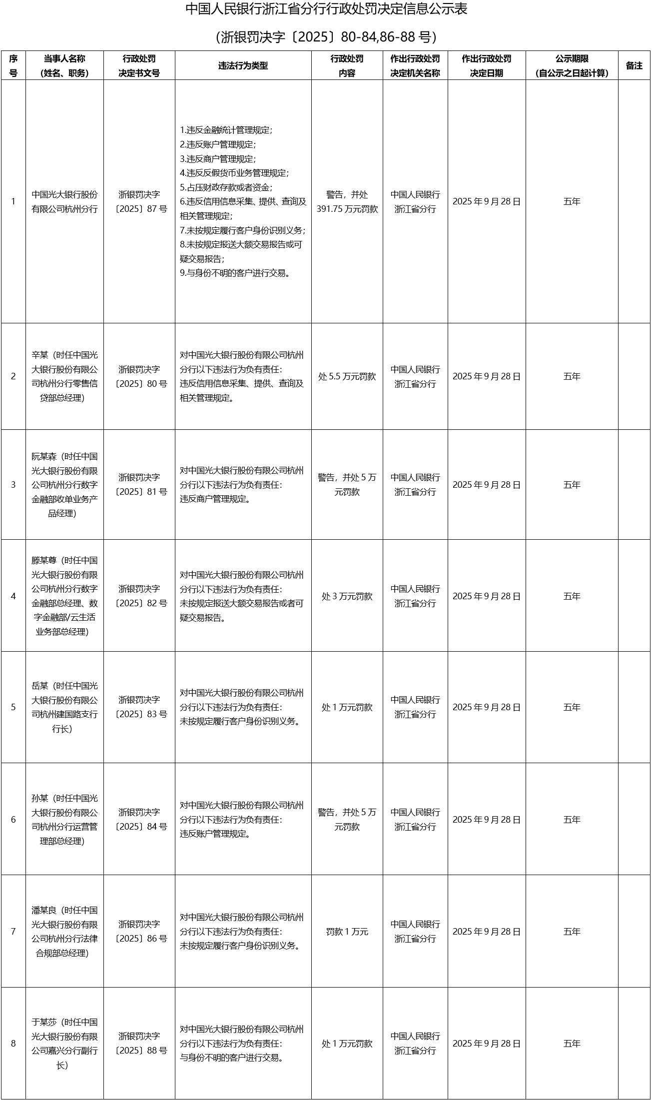 光大银行杭州分行因反洗钱等9项违法行为收391万罚单,7位高管同时被罚