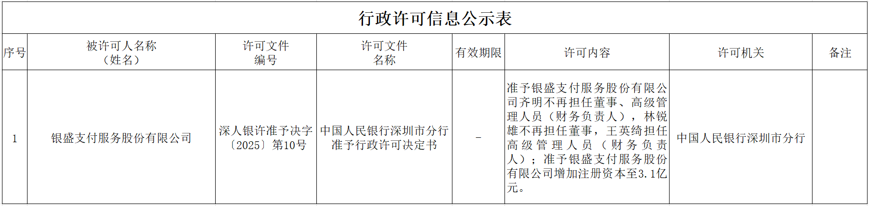 中国人民银行深圳市分行非银行支付机构变更行政许可决定信息公示表(2025年9月29日)显示,准予银盛支付服务股份有限公司(下称“银盛支付”)齐明不再担任董事、高级管理人员(财务负责人),林锐雄不再担任董事,王英绮担任高级管理人员(财务负责人);准予银盛支付增加注册资本至3.1亿元。