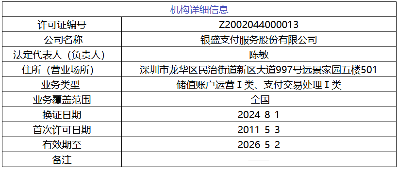 公开资料显示,银盛支付成立于2009年,总部位于深圳,是银盛科技服务集团旗下子公司,是2011年获得中国人民银行首批颁发《支付业务许可证》的支付机构,并在2016年、2021年已经两次成功续展支付牌照,允许在全国从事互联网支付、移动电话支付、银行卡收单业务。2024年《非银行支付机构监督管理条例》实施后,其业务类型更新为储值账户运营Ⅰ类、支付交易处理Ⅰ类。