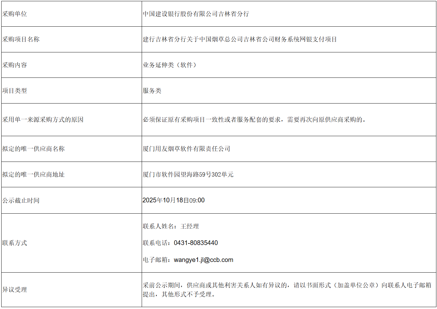 建行吉林省分行关于中国烟草总公司吉林省公司财务系统网银支付项目单一来源采前公示