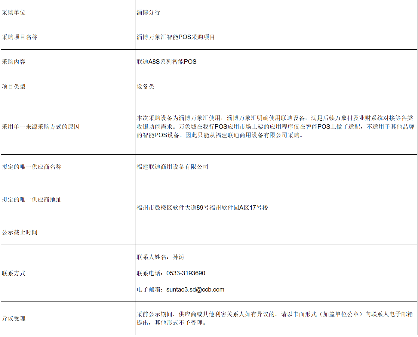 建行淄博分行淄博万象汇智能POS采购项目单一来源采前公示