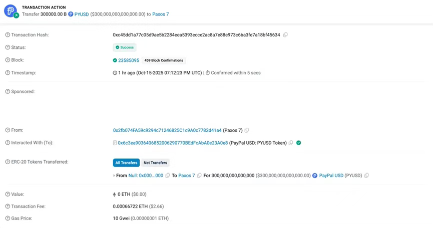 据移动支付网了解,美东时间10月16日15:12,PayPal稳定币发行商Paxos在以太坊链上执行内部转账时误铸造300万亿美元PYUSD,相当于全球GDP总和的两倍。该公司于发现后立即启动销毁流程,22分钟内将异常代币转入无法访问的钱包地址清除。