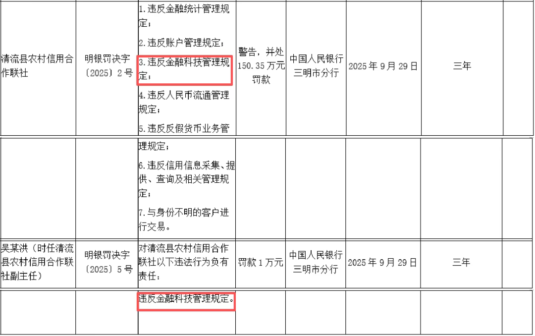 10月11日,中国人民银行三明市分行发布的行政处罚信息显示,清流县农村信用合作联社因“违反金融科技管理规定;与身份不明的客户进行交易”等7项违法行为,被警告,并被罚款150.35万元。同时,3人被罚,其中,时任该农信社主任(代为履职)郑某柏、普惠金融部经理曾某颖均对“与身份不明的客户进行交易”负有责任,时任该农信社副主任吴某洪对“违反金融科技管理规定”负有责任,各被罚款1万元。