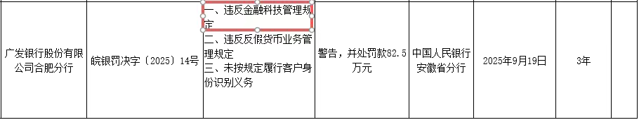 广发银行合肥分行因“违反金融科技管理规定;未按规定履行客户身份识别义务”等3项违法行为,被警告,并被罚款82.5万元。同时,时任该分行法律与合规部总经理助理黄某对“未按规定履行客户身份识别义务”负有责任,被罚款2万元。