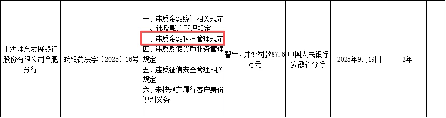 浦发银行合肥分行因“违反金融科技管理规定;违反征信安全管理相关规定;未按规定履行客户身份识别义务”等6项违法行为,被警告,并被罚款87.6万元。同时,时任该分行零售业务部总经理陈某、公司业务部总经理胡某均对“未按规定履行客户身份识别义务”负有责任,分别被罚款2万、1万元。