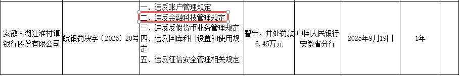 安徽太湖江淮村镇银行因“违反金融科技管理规定;违反征信安全管理相关规定”等5项违法行为,被警告,并被罚款6.45万元。