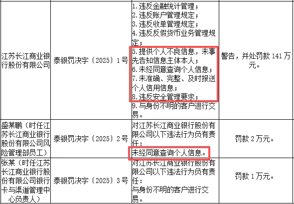 江苏长江商业银行因“提供个人不良信息,未事先告知信息主体本人;未经同意查询个人信息;未准确、完整、及时报送个人信用信息;违反安全管理要求;与身份不明的客户进行交易”等9项违法行为,被警告,并被罚款141万元。