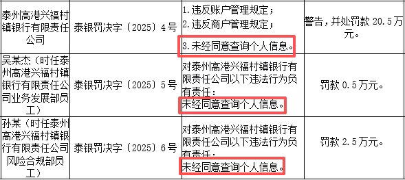泰州高港兴福村镇银行因“未经同意查询个人信息”等3项违法行为,被警告,并被罚款20.5万元。