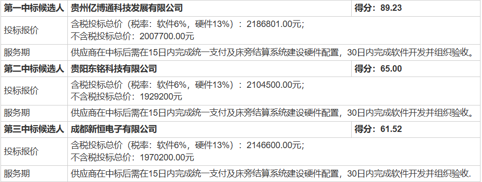 根据法律、法规、规章和采购文件的规定,贵航贵阳医院统一支付及床旁结算系统功能建设项目(二次)已于2025年10月15日在佰利建设管理(集团)有限公司(贵阳市观山湖区长岭北路6号大唐东原财富广场3号楼23层)进行开标评标工作,根据评标委员会出具的评标报告,现公示下列内容: