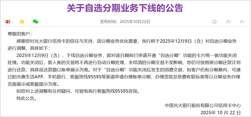 10 月 22 日,光大银行信用卡中心发布关于自选分期业务下线的公告。公告称,因分期业务优化需要,光大银行将于2025年12月9日(含)对自选分期业务进行调整,具体如下: