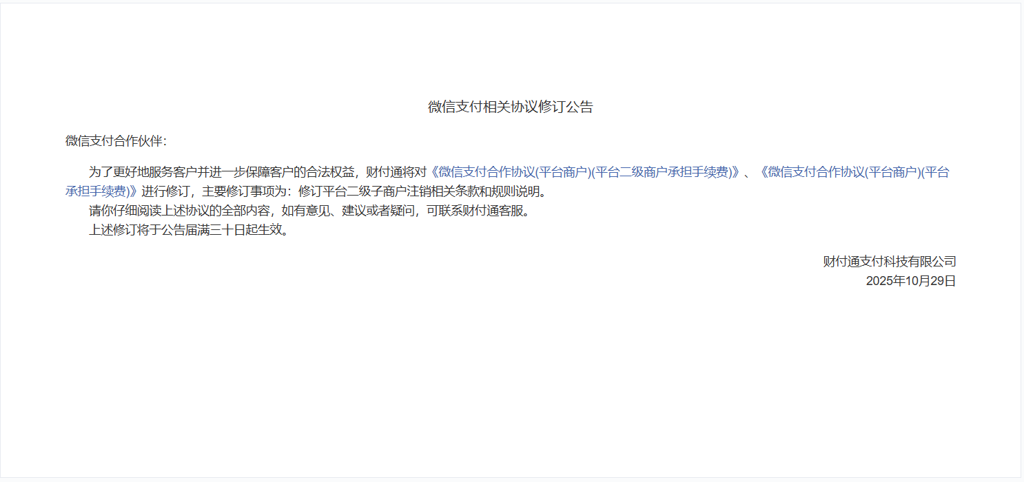 10月29日,财付通支付科技有限公司发布微信支付相关协议修订公告。公告称,为了更好地服务客户并进一步保障客户的合法权益,财付通将对《微信支付合作协议(平台商户)(平台二级商户承担手续费)》、《微信支付合作协议(平台商户)(平台承担手续费)》进行修订,主要修订事项为:修订平台二级子商户注销相关条款和规则说明。 请你仔细阅读上述协议的全部内容,如有意见、建议或者疑问,可联系财付通客服。 上述修订将于公告届满三十日起生效。