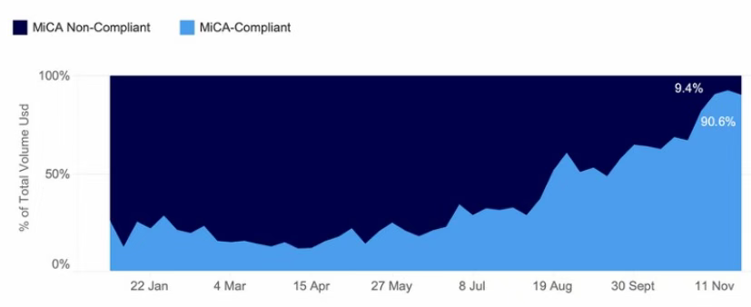 正如图所示,到11月中旬,MiCA合规加密资产已占据总交易量的 90.6%,而非合规加密资产仅剩 9.4%。这一数据变化直观反映了市场对监管要求的快速响应与适应。