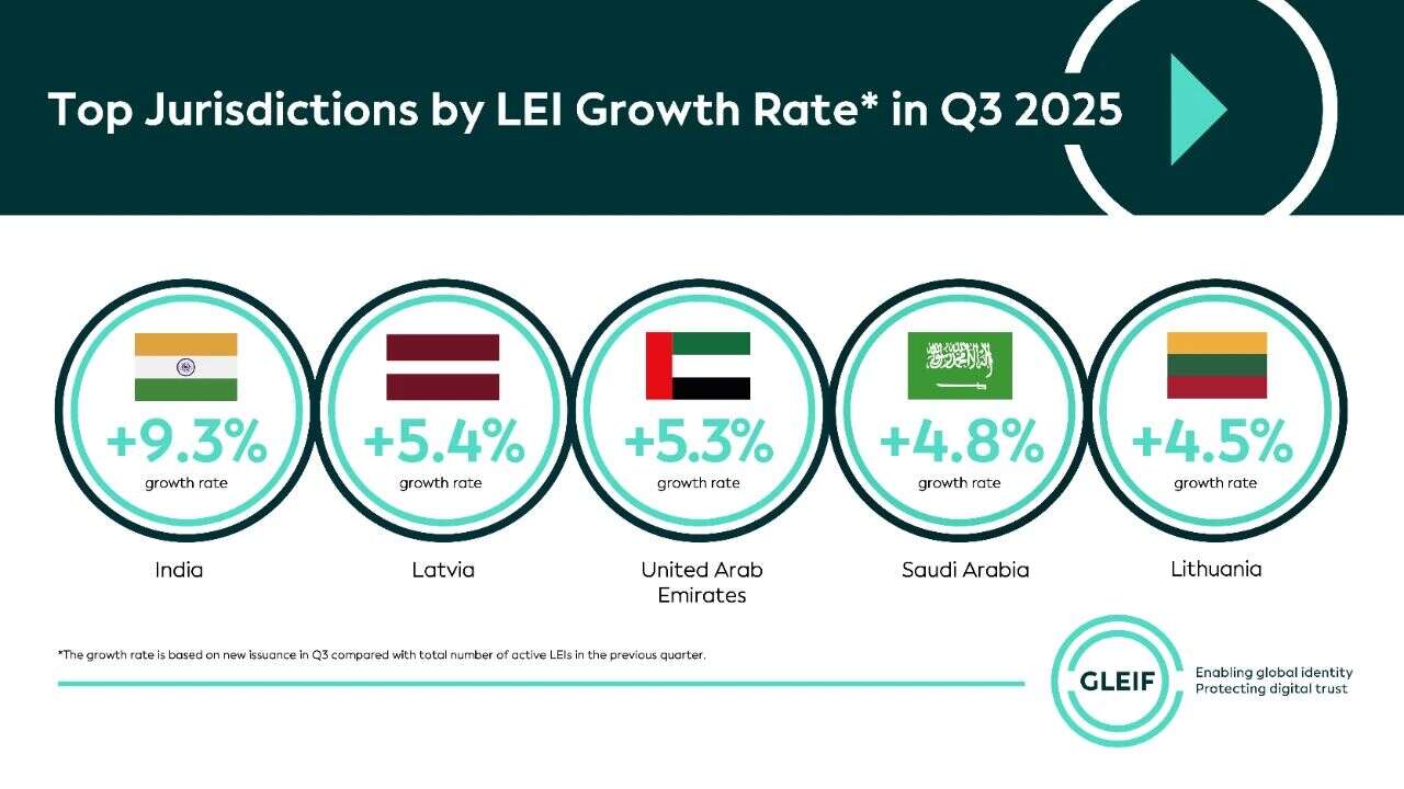 在全球司法管辖区中,印度再度见证了最高的LEI增长率,高达9.3%。这一增长归因于印度国家监管单位的坚定支持,使LEI成为印度金融体系稳定的关键支柱。除印度之外,拉脱维亚、阿拉伯联合酋长国、沙特阿拉伯、立陶宛等司法管辖区也实现了较高的增长率。