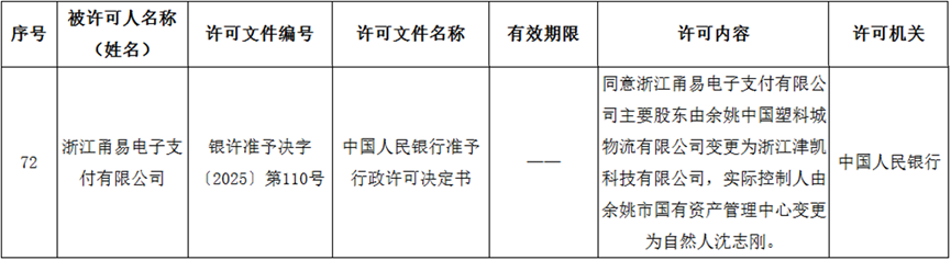 近日,人民银行官网公示的支付机构重大事项变更许可信息(截至2025年10月)显示,央行已同意浙江甬易电子支付有限公司(简称“甬易支付”)主要股东由余姚中国塑料城物流有限公司变更为浙江津凯科技有限公司(简称“津凯科技”),实际控制人由余姚市国有资产管理中心变更为自然人沈志刚。