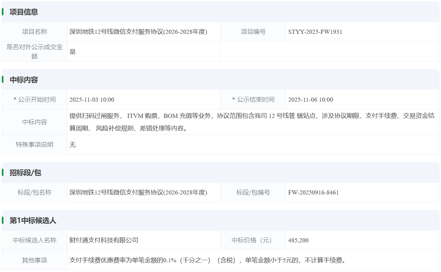 深圳地铁12号线微信支付服务协议(2026-2028年度)成交候选人公示
