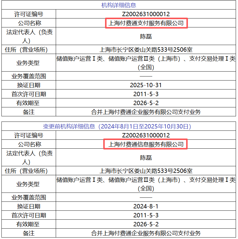 据移动支付网了解,付费通成立于2003年,并在2011年5月获得人民银行颁发的《支付业务许可证》,与支付宝、财付通都是首批获得支付牌照的机构。付费通原业务范围涵盖互联网支付、移动电话支付、固定电话支付、银行卡收单业务,资质较为优秀。2024年支付业务类型调整后,付费通业务类型调整为“储值账户运营Ⅰ类、储值账户运营Ⅱ类(上海市)、支付交易处理Ⅰ类(全国)”。